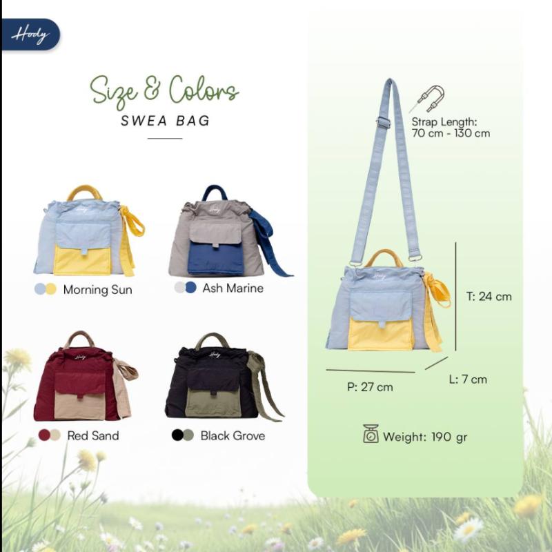 ? SPESIFIKASI SWEA BAG ? Material: Crinkle Premium Bag Size: P 27 cm × L 7 cm × T 24 cm Strap Type: Adjustable Strap Length: 70 cm – 130 cm Weight: 190 gr Closure Type: Magnetic Closure Lining: Crinkle Logo: Bordir Hody Interior: 1 Main Compartment with 1 Zipper Pocket Exterior: Front: 1 Pocket with Velcro Back: 1 Slip Pocket Side: 2 Pockets Utility: Handphone, Charger, Wallet, Parfum, Powerbank, Makeup Kit Color: - Morning Sky - Black Grove - Ash Marine - Red Sand Price: Rp 155.000,-