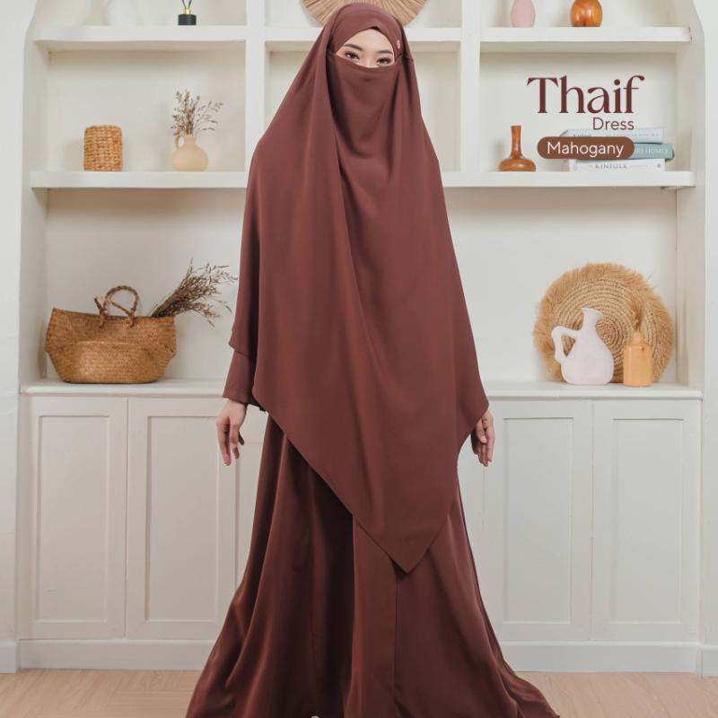 NEW LAUNCHING THAIF SERIES Thaif Series terdiri dari Dress dan French khimar, dengan menggunakan bahan sophia yang lembut, jatuh dan tidak panas. Thaif dress dilengkapi dengan resleting dibagian dada dan saku di kanan dan kiri. Tersedian 3 : Black Broken white Mahogany Size chart S LD92 PB135 M LD98 PB138 L LD104 PB140 XL LD110 PB145 XXL LD120 PB140