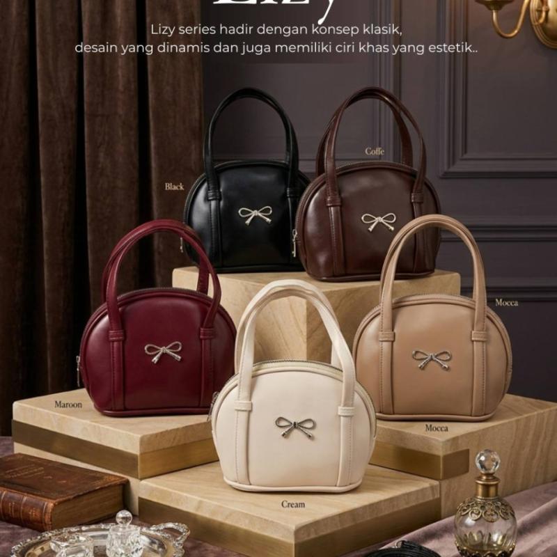 LIZY BAG BY AIKO tas selempang wanita dengan desain minimalis dan aksen pita emas yang manis. Berikut adalah spesifikasi lengkapnya: Detail Produk Ukuran: 18 X 16 CM Bahan: Kulit sintetis premium dengan tekstur halus. Desain: Berbentuk setengah lingkaran (dome) dengan detail pita logam berwarna emas di bagian depan. Tali: Dilengkapi dengan tali panjang yang dapat dilepas pasang atau disesuaikan ukurannya (selempang/sling bag) serta top handle untuk dijinjing. Pilihan Warna Tas ini hadir dalam 5 pilihan warna : Cream Coffe Mocca Maroon Black