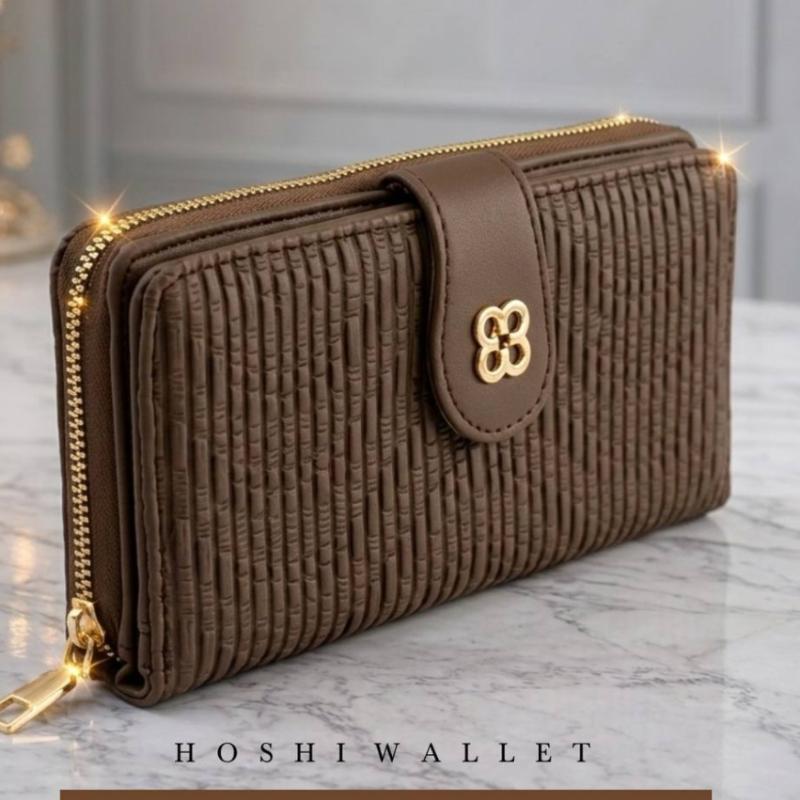 HOSHI WALLET Dompet ini memiliki ciri khas berupa kunci magnet di bagian luar dengan logo ornamen bunga atau empat lingkaran kecil yang menyatu. Detail Produk Bahan: Kulit sintetis lembut (soft suede). Dimensi: 19 X 10 CM Fitur: 9 slot kartu. 1 tempat foto transparan. 3 slot untuk uang kertas. 1 kompartemen resleting untuk koin atau barang berharga WARNA : BLACK, DUSTY, CREAM, MOCCA , GREY, BROWN HARGA : 69.000